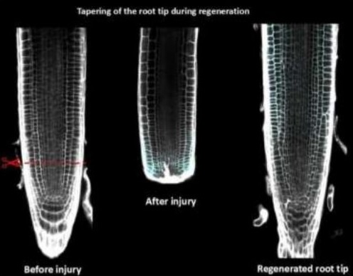 उन्नत सूक्ष्मदर्शी और उपकरणों (advanced microscopy) की मदद से टीम ने देखा कि जड़ों की सामान्य घनाकार कोशिकाओं की आकृति बदलकर समचतुर्भुज (rhomboid) हो गई। फिर ये परिवर्तित कोशिकाएं विकर्ण रेखा पर विभाजित हुईं जिससे त्रिकोणीय प्रिज़्म आकृति की कोशिकाएं बनीं। विकर्ण रेखा से विभाजन ने आस-पड़ोस की कोशिकाओं की वृद्धि (cell division) को एक तिरछे पथ पर मोड़ा, जिन्होंने मिलकर कटा हुआ पतला सिरा फिर से बनाया।